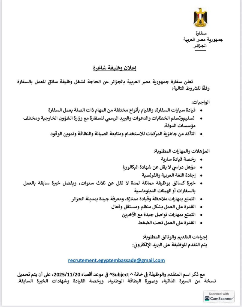 تعلن سفارة جمهورية مصر العربية بالجزائر عن الحاجة لشغل وظيفة سائق للعمل بالسفارة وفقاً للشروط التالية:
