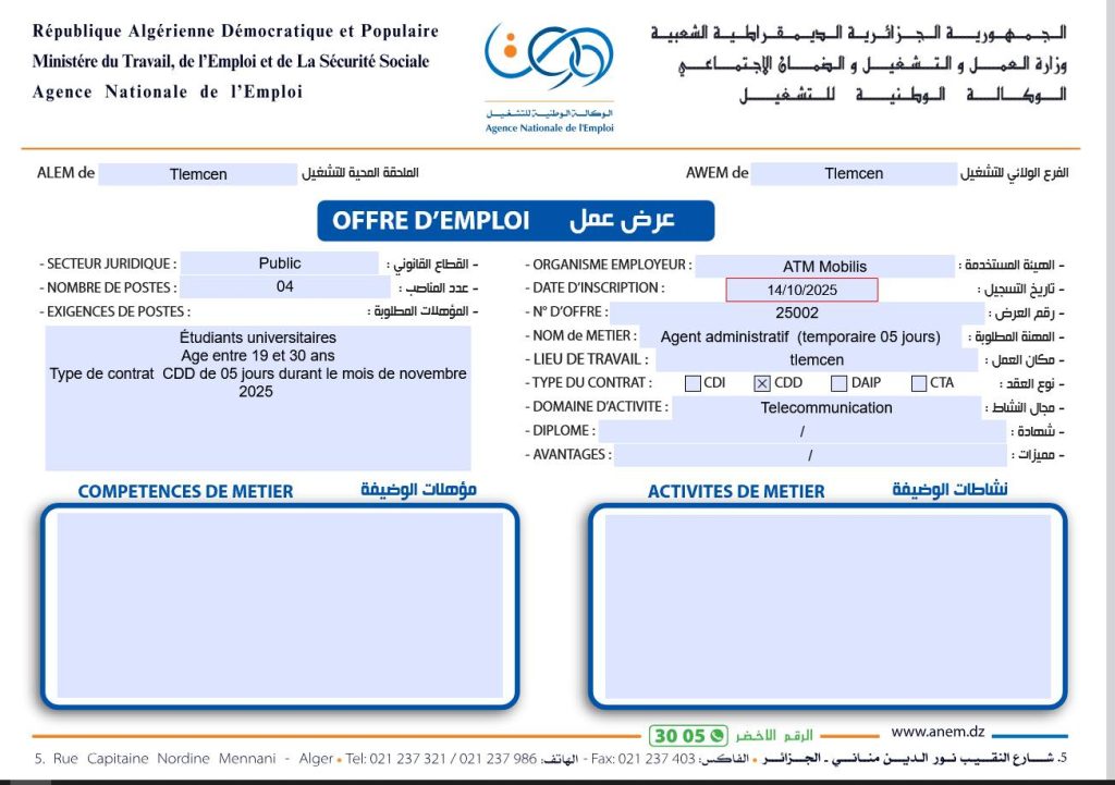 المهنة المطلوبة: Agent administratif (temporaire 05 jours)