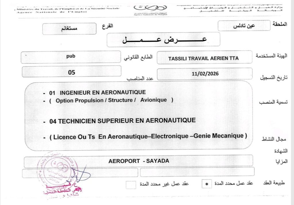 اعلان توظيف في شركة طاسيلي للعمل الجوي TASSILI TRAVAIL AERIEN