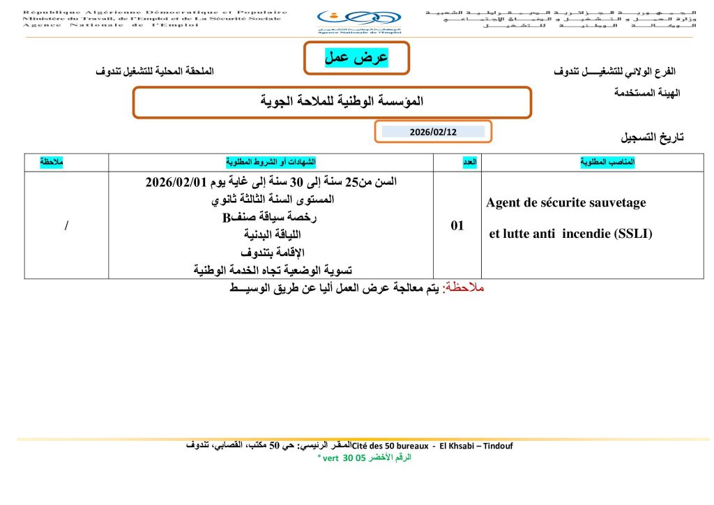 Agent de sécurité sauvetage et lutte anti incendie (SSLI)01* السن من 25 سنة إلى 30 سنة إلى غاية يوم 2026/02/01