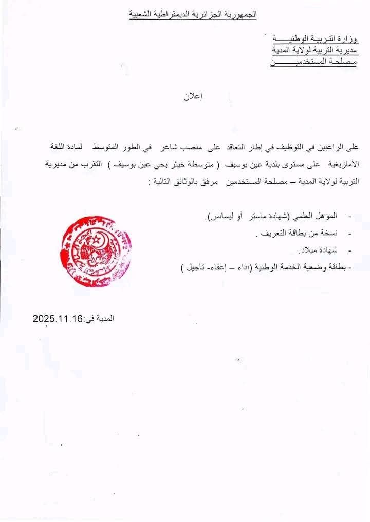 على الراغبين في التوظيف في إطار التعاقد على منصب شاغر في الطور المتوسط لمادة اللغة الأمازيغية على مستوى بلدية عين يوسـف (متوسطة خيثر يحي عين يوسف) التقرب من مديرية التربية لولاية المدية – مصلحة المستخدمين مرفق بالوثائق التالية: