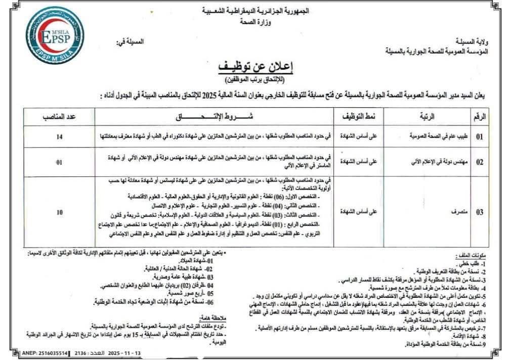 يعلن السيد المدير المؤسسة العمومية للصحة الجوارية بالمسيلة عن فتح مسابقة للتوظيف الخارجي بعنوان السنة المالية 2025 للإلتحاق بالمناصب المبينة في الجدول أدناه: