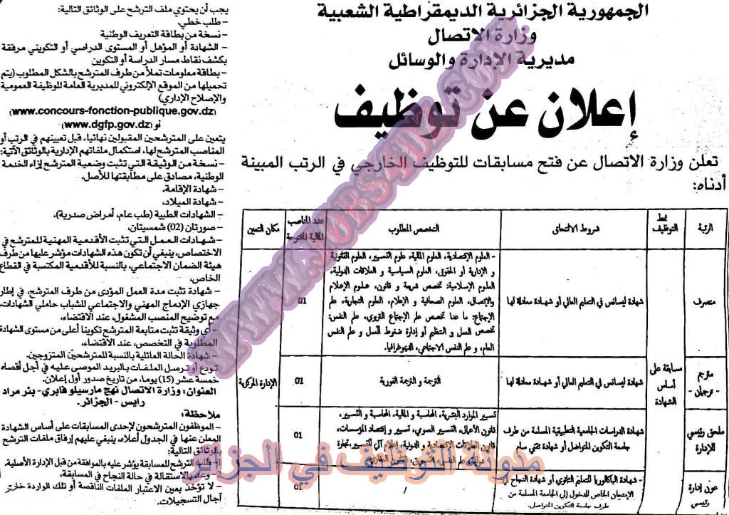 تعلن وزارة الاتصال عن فتح توظيف خارجي على اساس الشهادة في الرتب المبينة ادناه