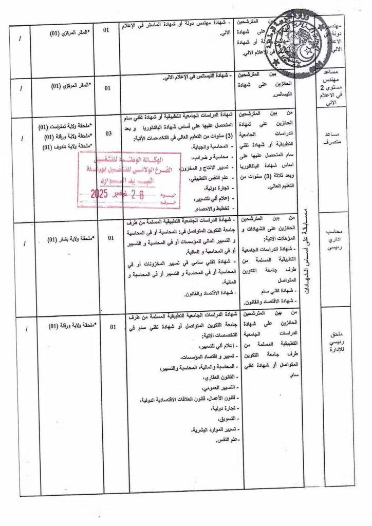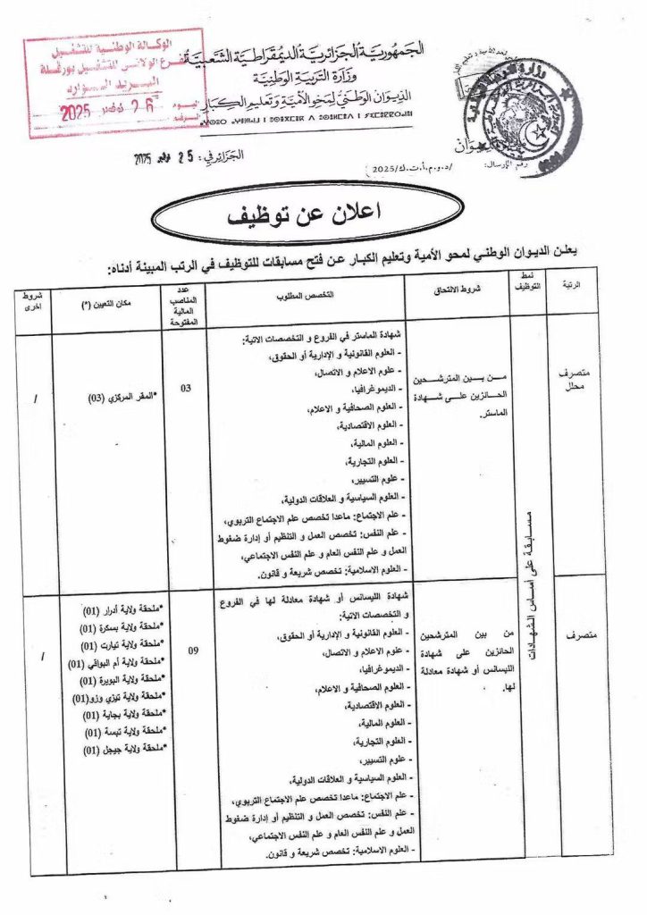 يعلن الديوان الوطني لمحو الأمية وتعليم الكبار عن فتح مسابقات للتوظيف في الرتب المبينة أدناه: