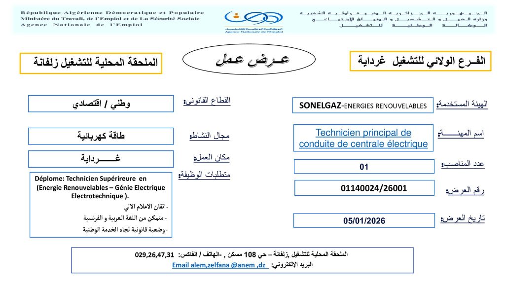 الهيئة المستخدمة: الشركة الجزائرية للكهرباء و الغاز – الطاقات المتجددة