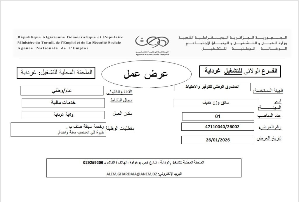 متطلبات الوظيفة: رخصة سياقة صنف ب، خبرة في المنصب سنة واحدة.