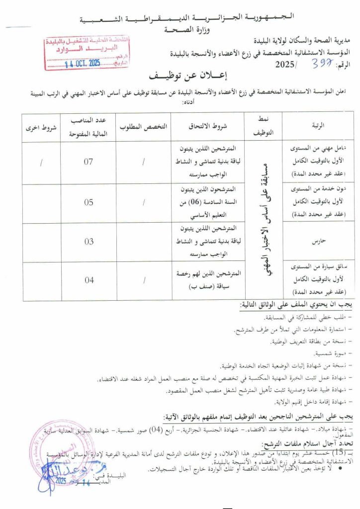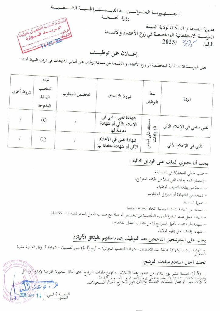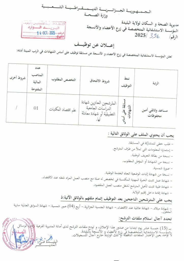 تعلن المؤسسة الإستشفائية المتخصصة في زرع الأعضاء و الأنسجة عن مسابقة توظيف في الرتب المبينة أدناه: