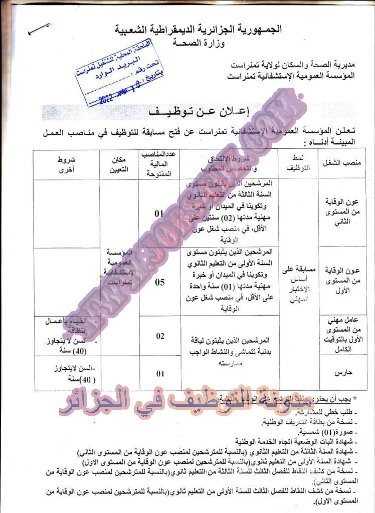 اعلان عن توظيف بالمؤسسة العمومية الاستشفائية تمنراست
