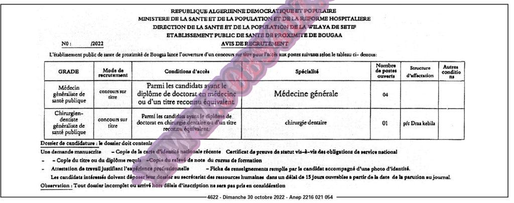 تعلن المؤسسة العمومية للصحة الجوارية بوقاعة سطيف عن فتح توظيف على اساس الشهادة في الرتب المبينة ادناه