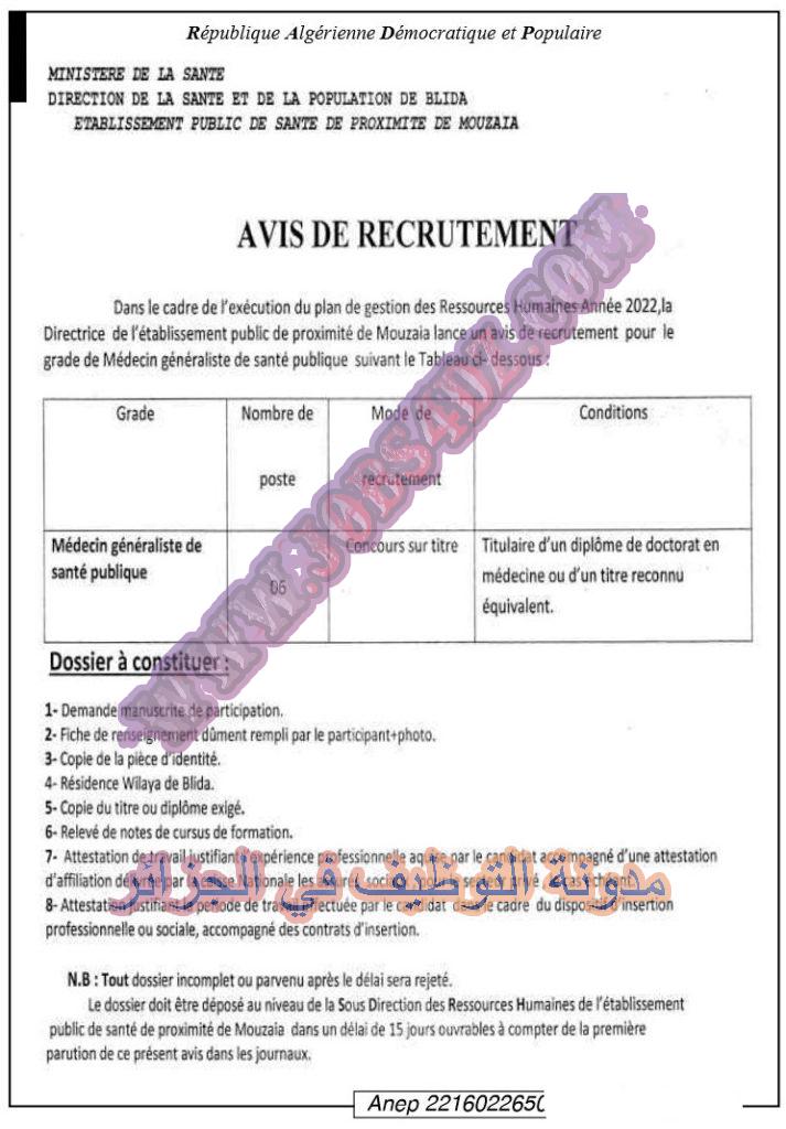 تعلن المؤسسة العمومية للصحة الحوارية موزاية ولاية البليدة عن فتح مسابقات توظيف على اساس الشهادة في الرتب المبينة ادناه