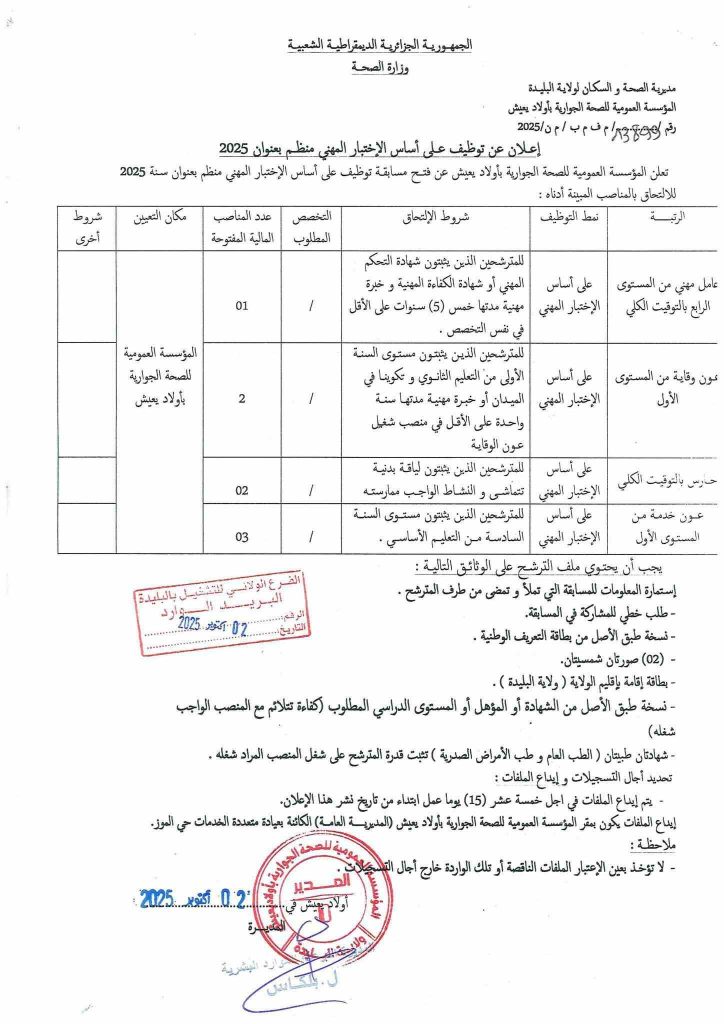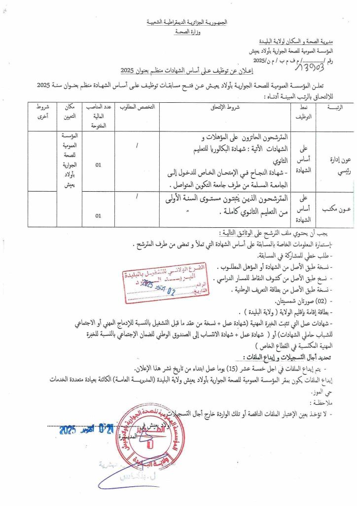 تعلن المؤسسة العمومية الجوارية لأولاد يعيش عن فتح مسابقة توظيف على أساس الشهادة وعلى وأساس الإختيار المهني منظم بعنوان سنة 2025 للإلتحاق بالمناصب المبينة أدناه: