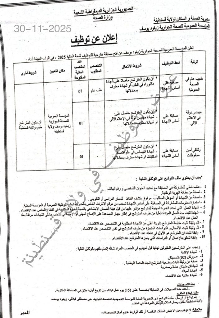 تعلن المؤسسة العمومية للصحة الجوارية زيغود يوسف عن فتح مسابقة خارجية للتوظيف للسنة المالية 2025، في الرتب المبينة أدناه: