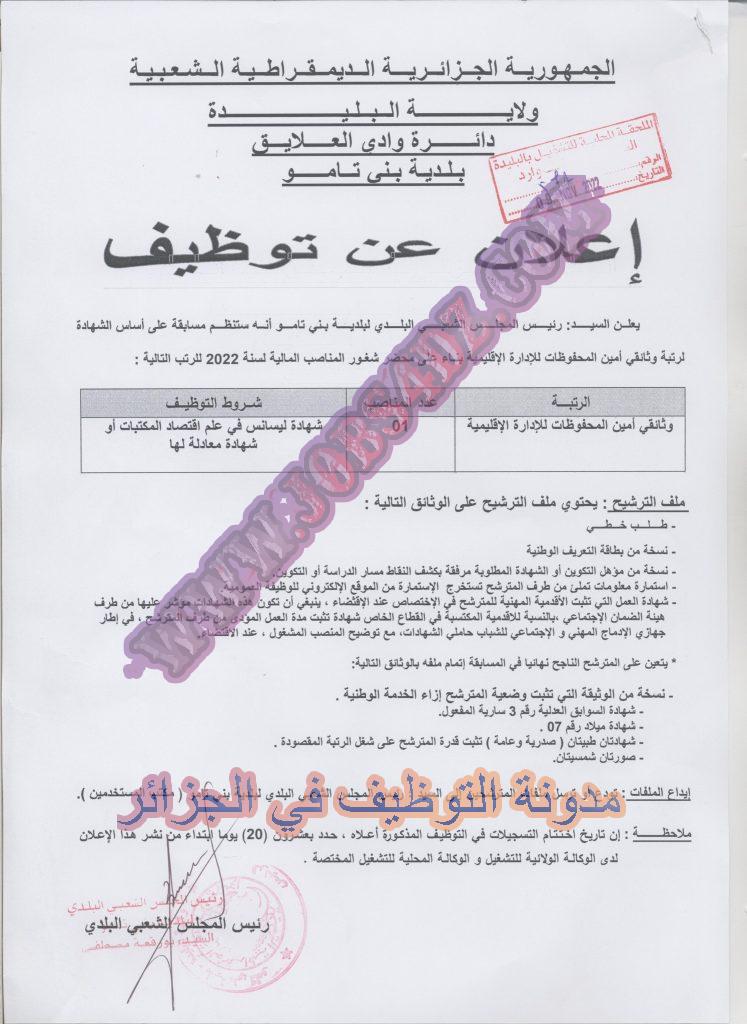 اعلان عن توظيف بالمجلس الشعبي البلدي لبلدية بني تامو ولاية البليدة