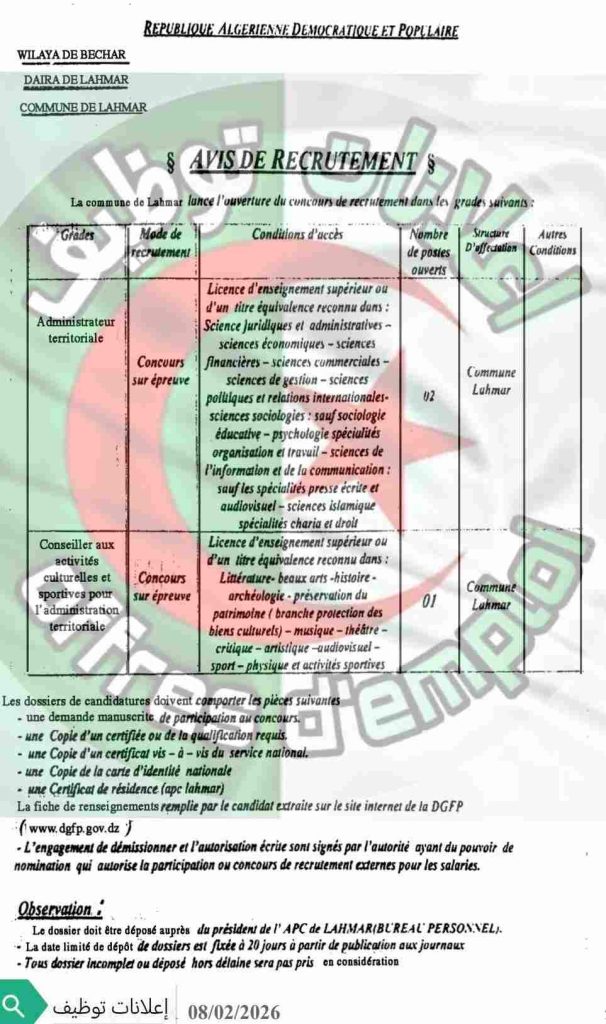 | مستشار في الأنشطة الثقافية والرياضية للإدارة الإقليمية | مسابقة على أساس الاختبارات | شهادة ليسانس في التعليم العالي أو شهادة معادلة لها معترف بها في: الأدب – الفنون الجميلة – التاريخ – الآثار – الحفاظ على التراث (فرع حماية الممتلكات الثقافية) – الموسيقى – المسرح – النقد الفني – السمعي البصري – الرياضة – التربية البدنية والرياضية. | 01 | بلدية لحمر | / |