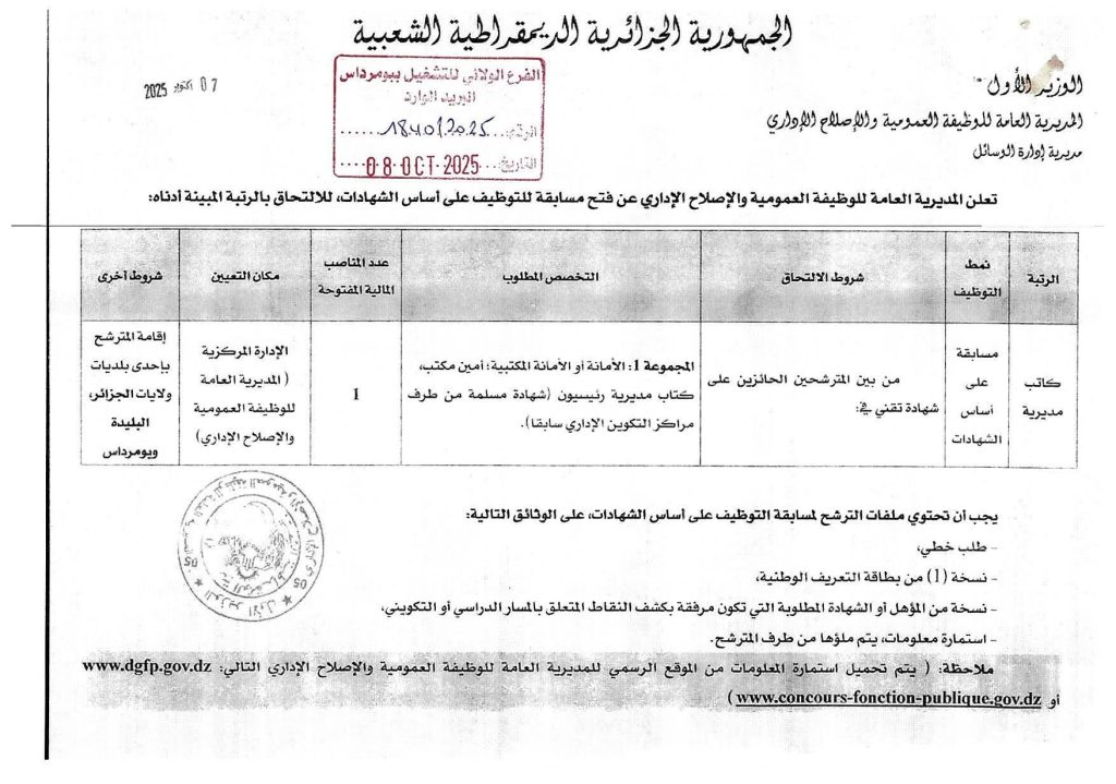 كاتب مديريةمسابقة على أساس الشهاداتمن بين المترشحين الحائزين على شهادة تقني فني.المجموعة أ: الأمانة أو الأمانة المكتبية، أمين مكتب، كاتب مديرية رئيسي (شهادة مسلمة من طرف مراكز التكوين الإداري سابقًا).1الإدارة المركزية بإحدى بلديات ولايات الجزائر، البلدية و بوڤميداسإقامة المترشح بإحدى بلديات ولايات الجزائر