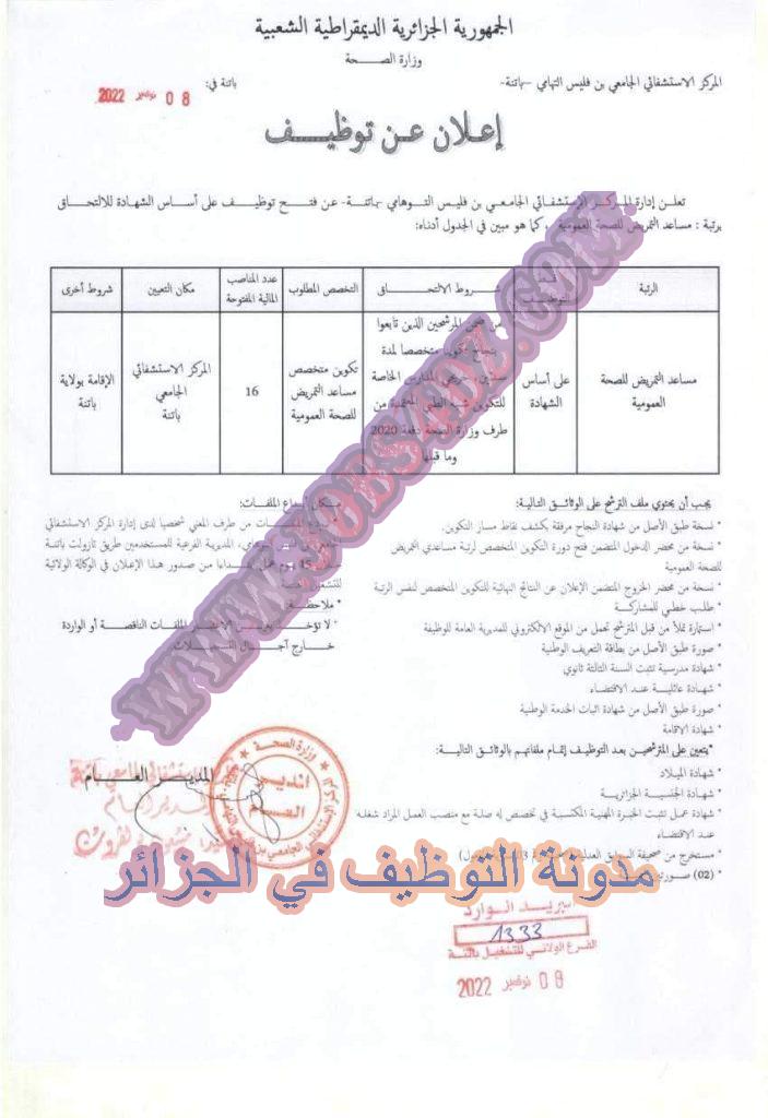 اعلان عن توظيف بالمركز الاستشفائي الجامعي بن فليس التوهامي بباتنة