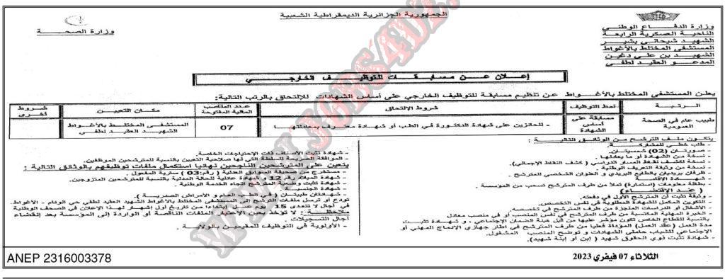 يعلن المستشفى المختلط بالاغواط عن فتح مسابقة توظيف على اساس الشهادة في الرتب المبينة ادناه