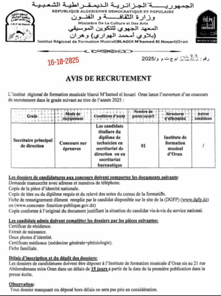 سكرتير رئيسي مديريةمسابقة على أساس الاختباراتالمترشحون الحائزون على شهادة تقني في سكرتارية الإدارة أو في السكرتارية المكتبية01معهد التكوين الموسيقي لوهران/
