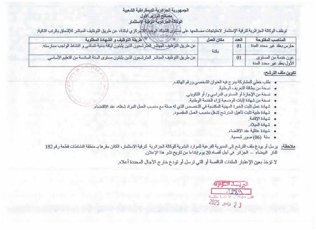 توظف الوكالة الجزائرية لترقية الإستثمار لإحتياجات مصالحها على مستوى التمثيل الوحيد المركزي ليلتحق، عن طريق التوظيف المباشر للإلتحاق بالرتب التالية: