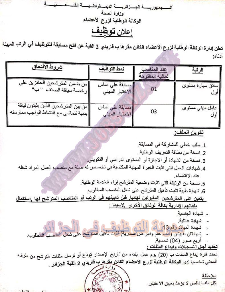 تعلن بالوكالة الوطنية لزرع الأعضاء الكائن مقرها بڨاريدي 2 بالقبة الجزائر العاصمة عن فتح مسابقة توظيف على اساس الإختبار المهني في الرتب المبينة ادناه