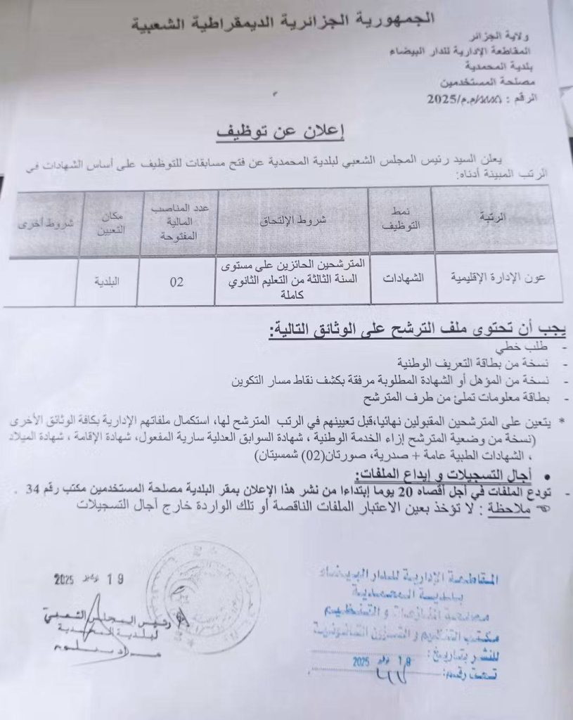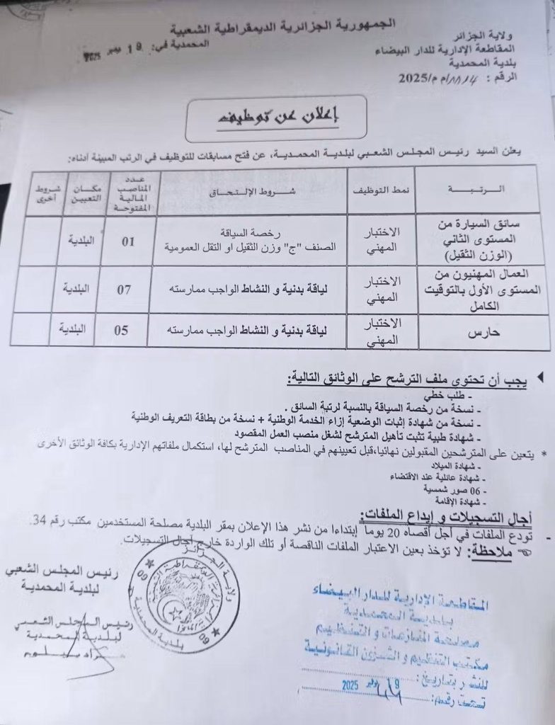 يعلن رئيس المجلس الشعبي البلدي للمحمدية عن فتح مسابقات للتوظيف على أساس الشهادات وعلى اساس الاختبار المهني في الرتب المبينة أدناه: