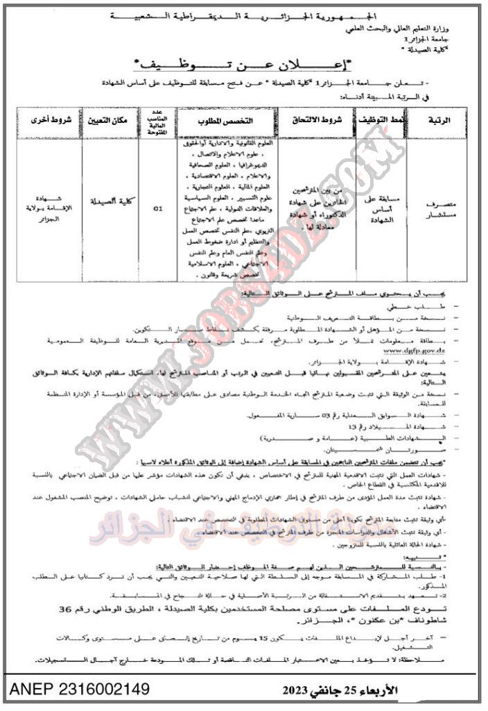 تعلن جامعة الجزائر 1 “كلية الصيدلة” عن فتح مسابقة توظيف على اساس الشهادة في الرتب المبينة ادناه