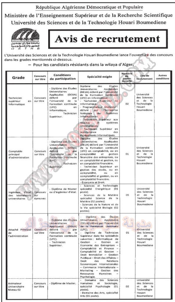 تعلن جامعة العلوم والتكنولوجيا هواري بومدين عن فتح مسابقة توظيف على اساس الشهادة في الرتب المبينة ادناه