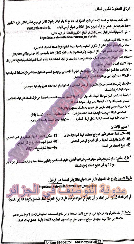اعلان عن توظيف بجامعة محمد بوضياف بالمسيلة