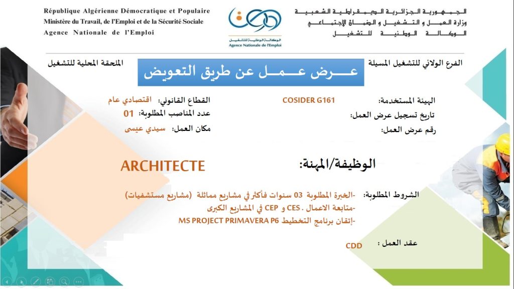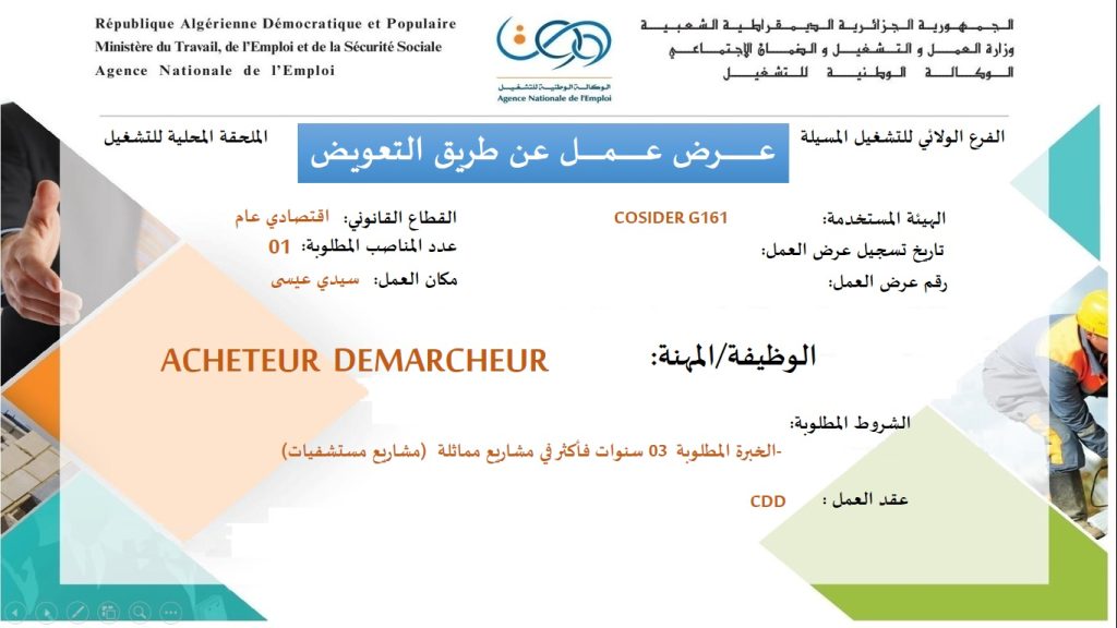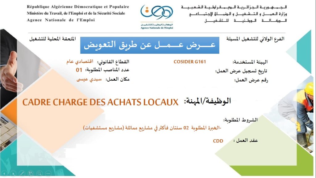 اعلان عن توظيف بشركة كوسيدار Cosider G161 شاركها Facebook Twitter LinkedIn Pinterest الملحقة المحلية للتشغيل المسيلة عرض عمل شركة كوسيدار Cosider G161 ads تعلن الملحقة المحلية للتشغيل