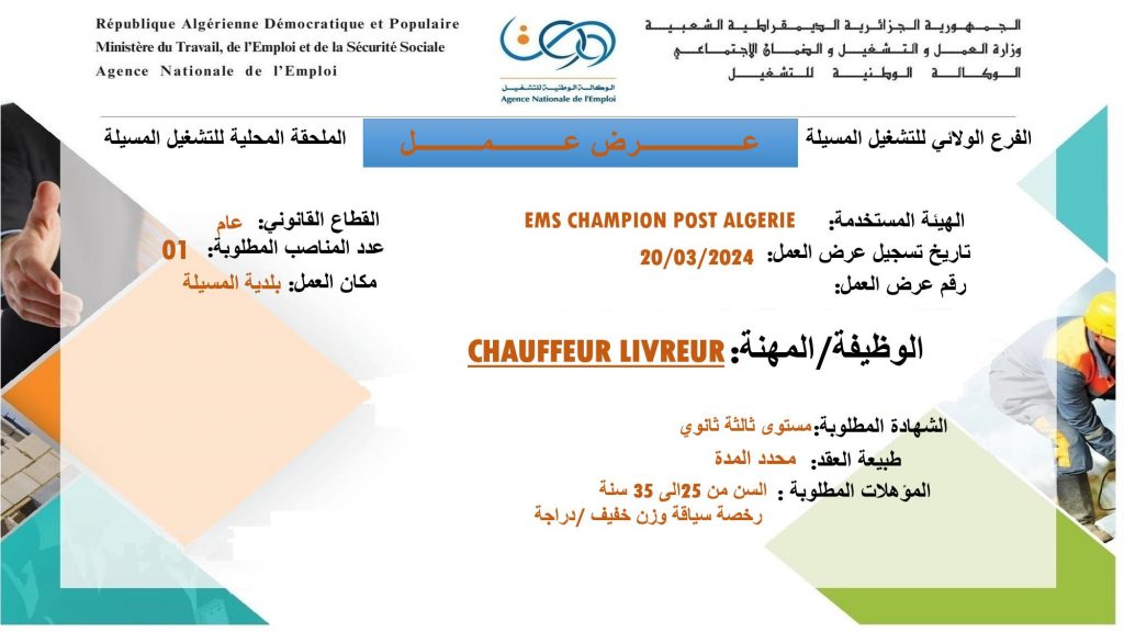 اعلان عن توظيف بمؤسسة البريد السريع EMS شاركها Facebook Twitter LinkedIn Pinterest الفرع الولائي للتشغيل المسيلة الملحقة المحلية للتشغيل