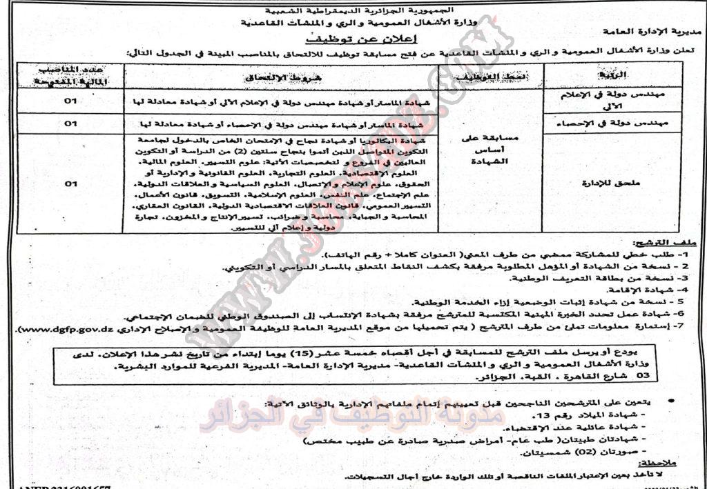 تعلن مديرية الاشغال العمومية والري والمنشات القاعدية عن فتح مسابقة توظيف على اساس الشهادة في الرتب المبينة ادناه
