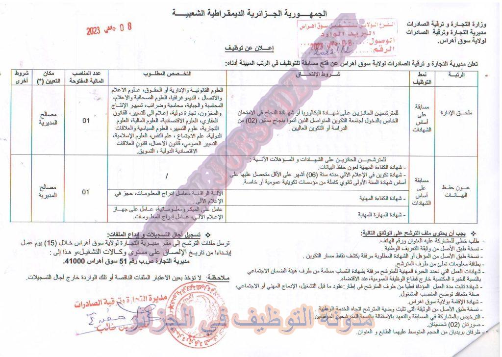 تعلن مديرية التجارة والترقية الصادرات لولاية سوق اهراس عن فتح مسابقة توظيف على اساس الشهادة في الرتب المبينة ادناه