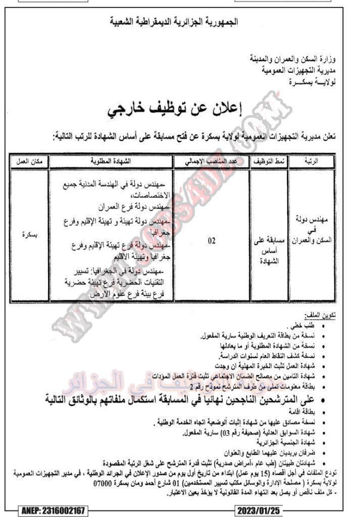 تعلن مديرية التجهيزات العمومية لولاية بسكرة عن فتح مسابقة توظيف على اساس الشهادة في الرتب المبينة ادناه