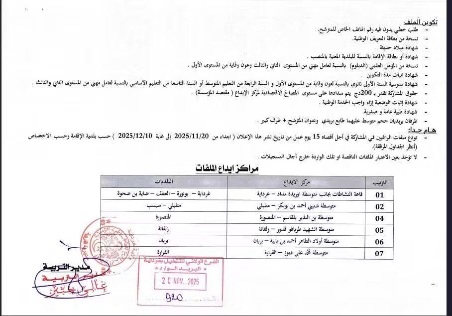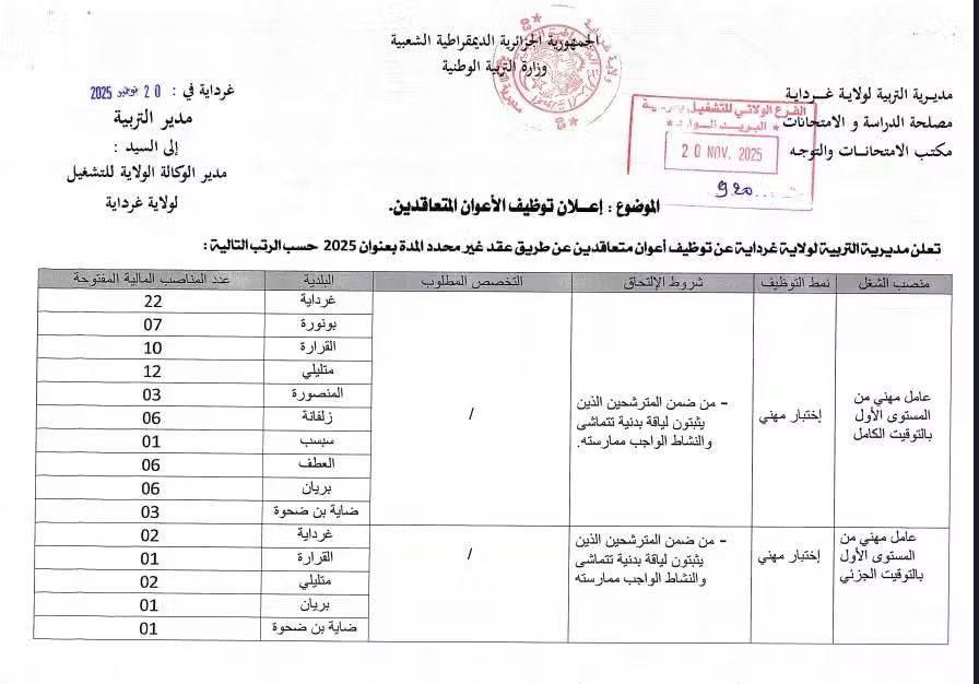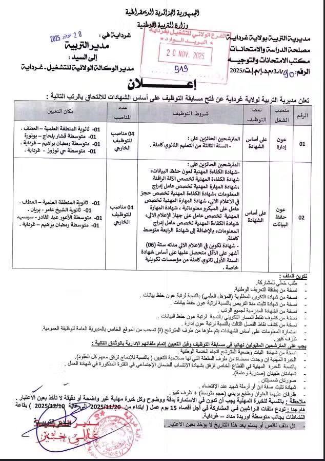 تعلن مديرية التربية لولاية غرداية عن فتح مسابقة توظيف للالتحاق بالرتب التالية: