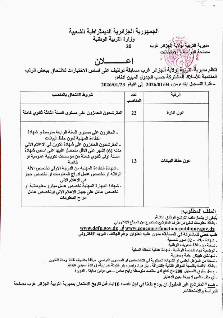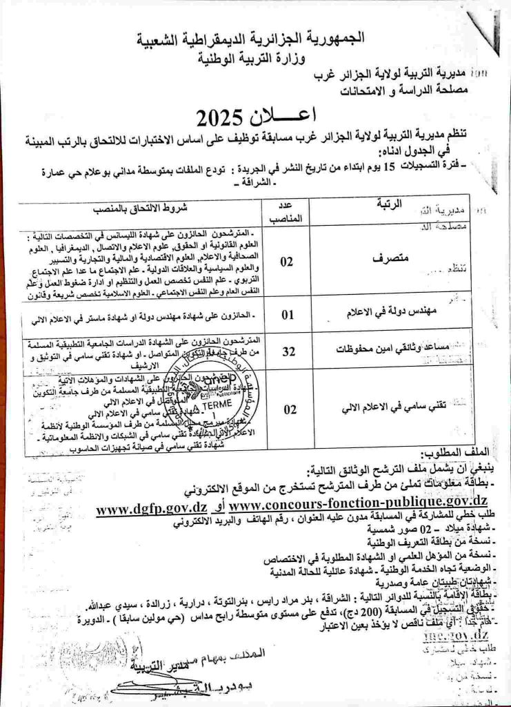 - اعلان عن توظيف بمديرية التربية لولاية الجزائر غرب أكثر من 300 منصب اداريين وعمال مهنيين