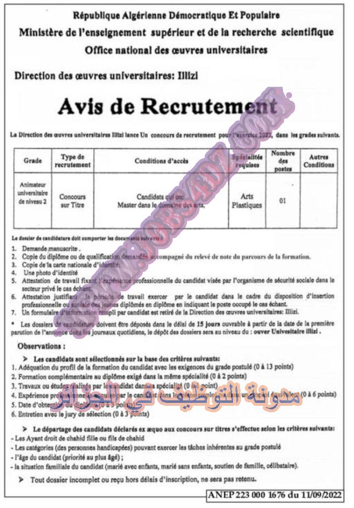 تعلن مديرية الخدمات الجامعية لولاية ايليزي عن فتح توظيف على اساس الشهادة في الرتب المبينة ادناه