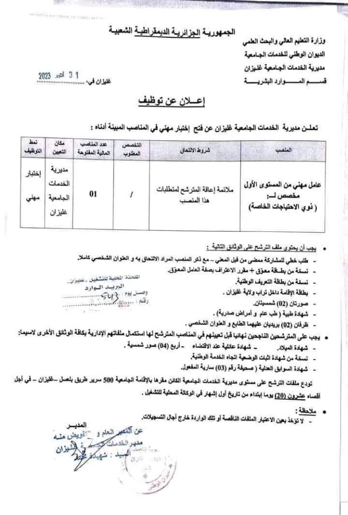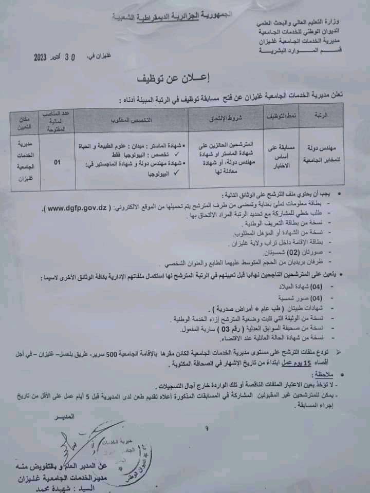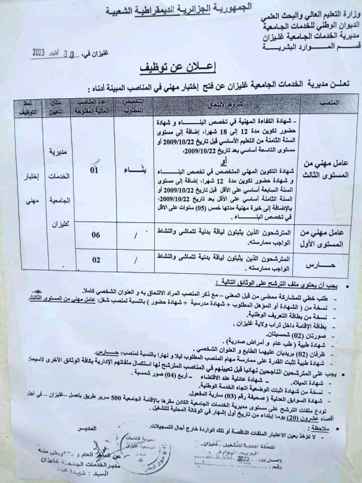 اعلان عن توظيف بمديرية الخدمات الجامعية غليزان شاركها Facebook Twitter LinkedIn Pinterest اعلان عن توظيف مديرية الخدمات الجامعية غليزان ads تعلن مديرية الخدمات الجامعية غليزان عن فتح مسابقة توظيف في الرتب المبينة ادناه