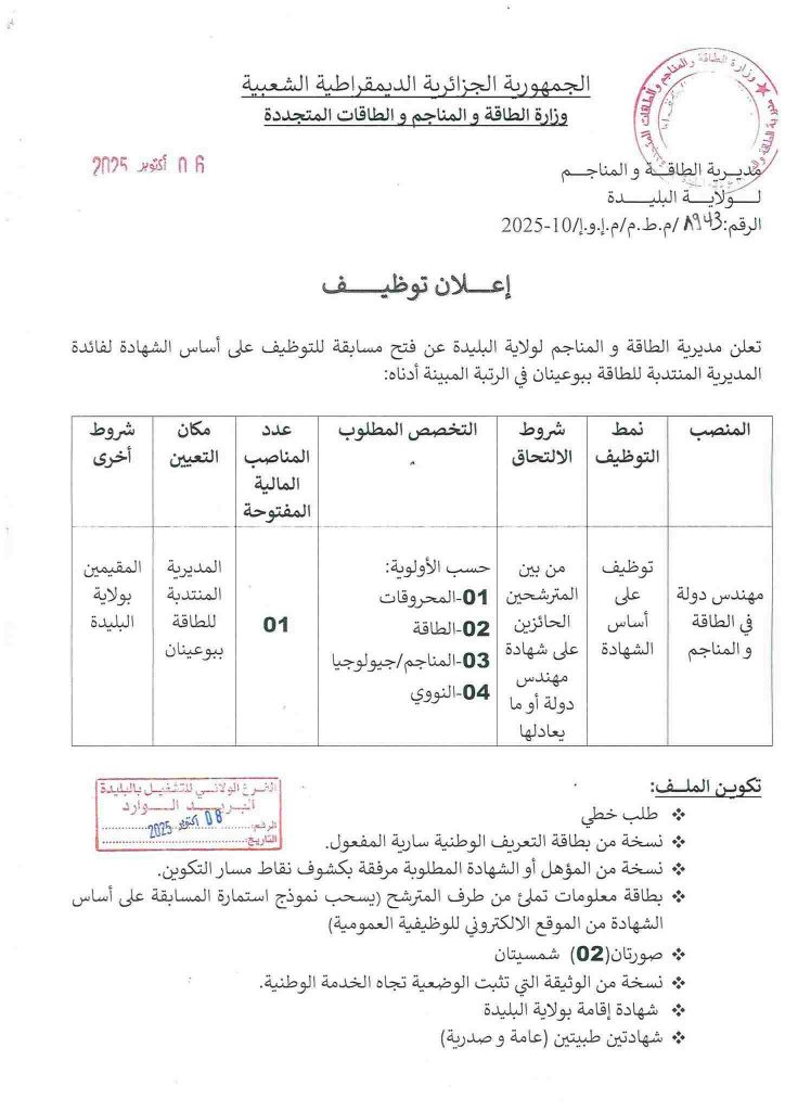 مهندس دولة في الطاقة والمناجمتوظيف على أساس الشهادةمن بين المترشحين الحائزين على شهادة مهندس دولة أو ما يعادلهاحسب الأولوية: 01-المحروقات 02-الطاقة 03-المناجم/جيولوجيا 04-النووي01المديرية المنتدبة للطاقة ببوعينانالمقيمين بولاية البليدة