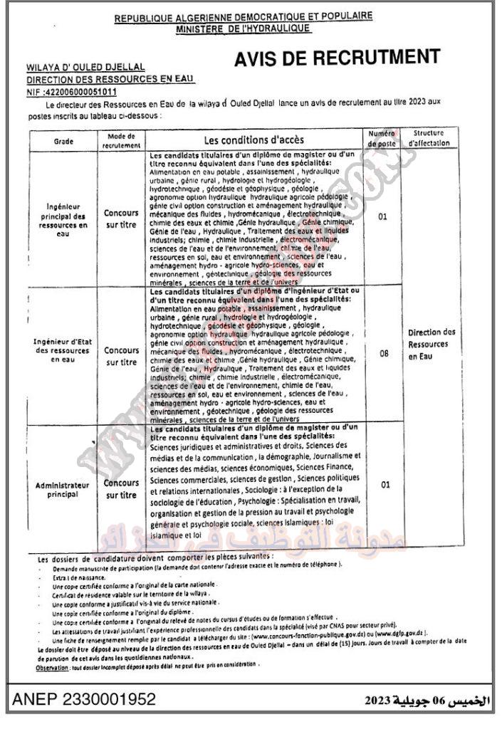 تعلن مديرية الموارد المائية اولاد جلال عن فتح مسابقة توظيف على اساس الشهادة في الرتب المبينة ادناه