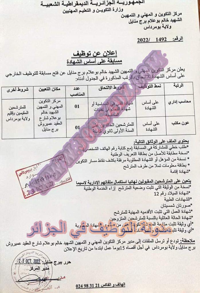 تعلن مركز التكوين المهني والتمهين الشهيد خالم بوعلام برج منايل عن فتح توظيف على اساس الشهادة في الرتب المبينة ادناه