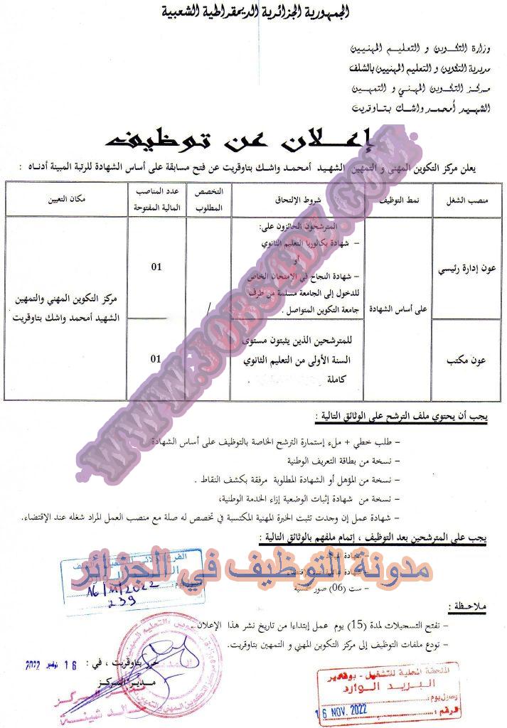 يعلن مركز التكوين المهني والتمهين الشهيد امحمد واش بالشلف عن فتح مسابقة توظيف على اساس الشهادة في الرتب المبينة ادناه