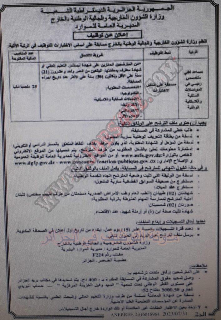 تعلن وزارة الشؤون الخارجية والجالية الوطنية بالخارج عن فتح مسابقة توظيف على اساس الاختبارات في الرتب المبينة ادناه