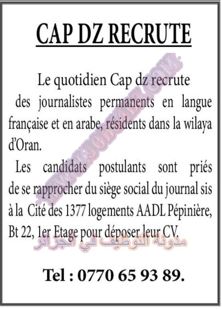 تعلن صحيفة Cap Ouest اليومية عن توظيف صحفيين دائمين ناطقين باللغة الفرنسية و العربية للمقيمين بولاية وهران.