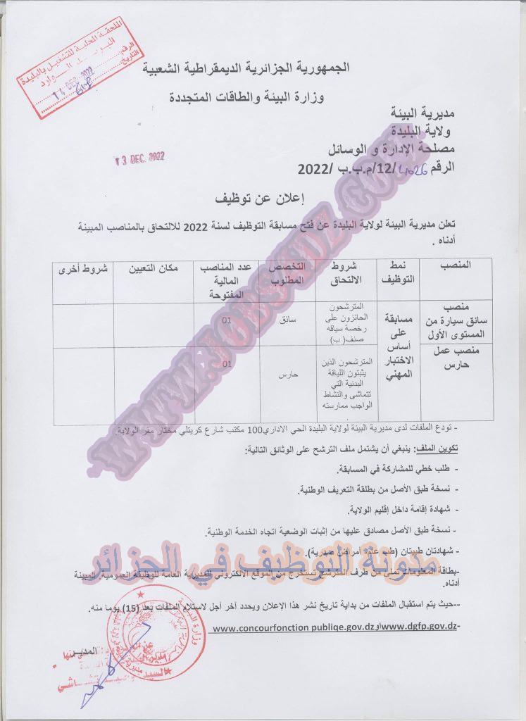 تعلن مديرية البيئة لولاية البليدة عن فتح مسابقة توظيف على اساس الاختبار المهني في الرتب المبينة ادناه