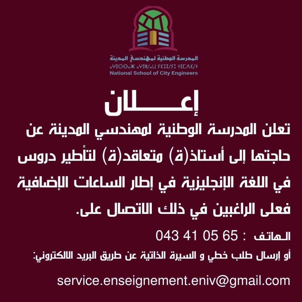 تعلن المدرسة الوطنية لمهندسي المدينة عن حاجتها إلى أستاذ(ة) متعاقد(ة) لتأطير دروس في اللغة الإنجليزية في إطار الساعات الإضافية.