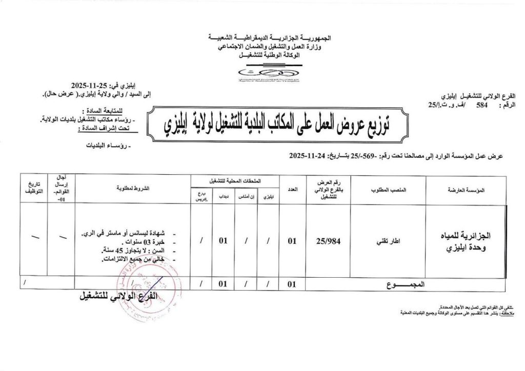 توزيع عروض العمل على المكتب البلدية للتشغيل لولاية إيليزي
