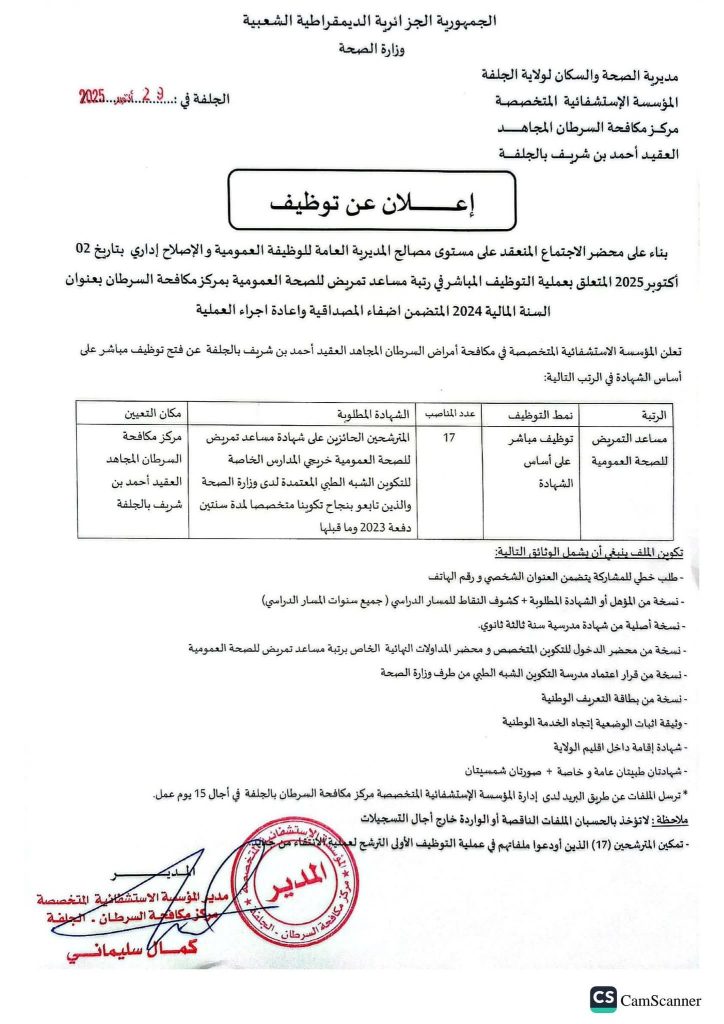 | مساعد تمريض للصحة العمومية | توظيف مباشر على أساس الشهادة | المترشحين الحائزين على شهادة مساعد تمريض للصحة العمومية خريجي المدارس الخاصة للتكوين الشبه الطبي المعتمدة لدى وزارة الصحة والذين تابعوا بنجاح تكوينا متخصصا لمدة سنتين دفعة 2023 وما قبلها | 17 | مركز مكافحة السرطان المجاهد العقيد أحمد بن شريف بالجلفة |