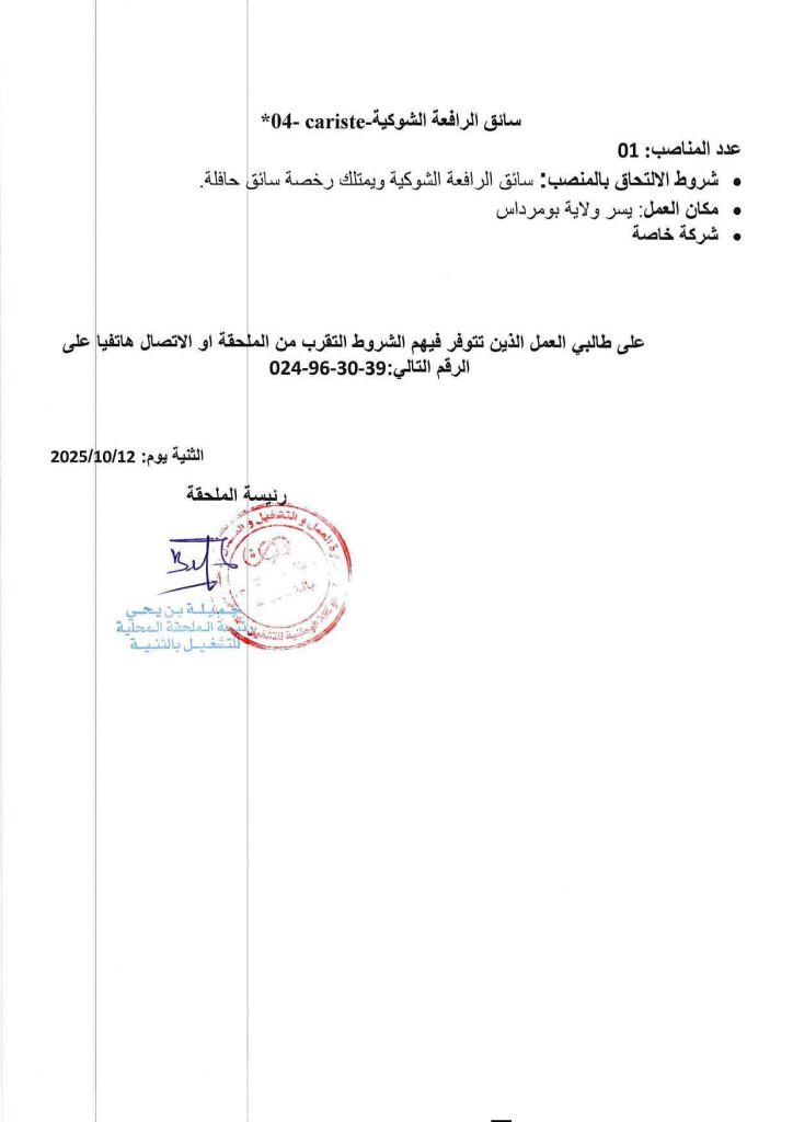 على طالبي العمل الذين تتوفر فيهم الشروط التقرب من الملحقة أو الاتصال هاتفيا على الرقم التالي: 39-30-96-024