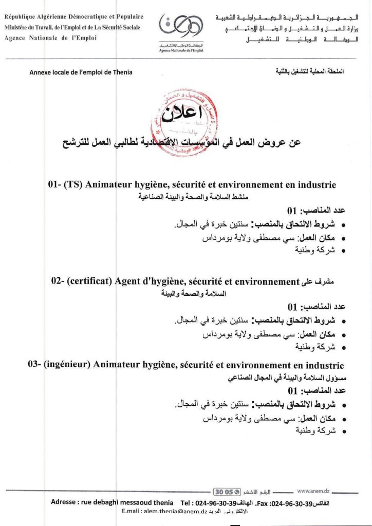 • 03 – (ingénieur) Animateur hygiène, sécurité et environnement en industrieمسؤول السلامة والبيئة في المجال الصناعي