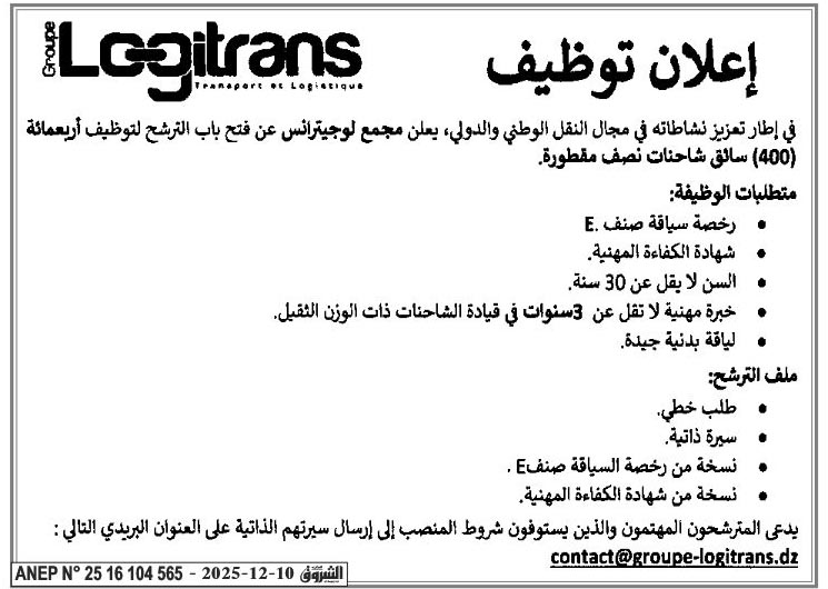 في إطار تعزيز نشاطاته في مجال النقل الوطني والدولي، يعلن مجمع لوجيترانس عن فتح باب الترشح لتوظيف أربعمائة (400) سائق شاحنات نصف مقطورة.